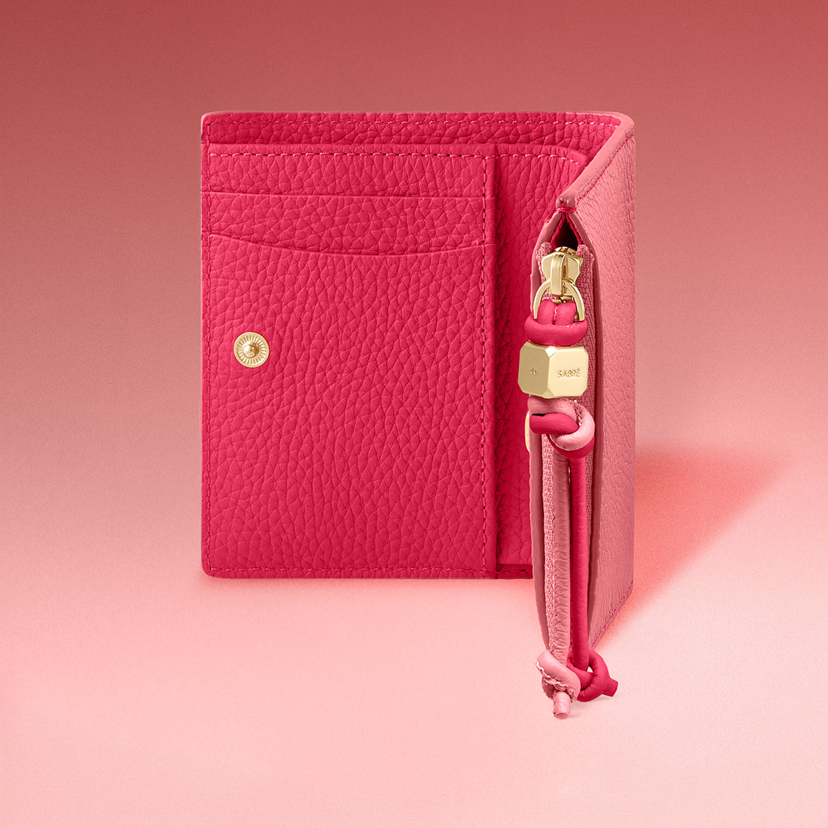 手のひらサイズの二つ折りウォレットがホリデー仕様に。2つの隠しポケットを含む計6スロットのカード収納、紙幣収納、ジップコインポーチを装備。デュアルトーンの革引手と光沢ゴールドパーツで限定感を演出。フルグレインペブルドレザーで仕立て、スナップボタンでカードと紙幣を保護しつつ、コインはすぐ取り出せる設計に。手作業で仕上げた限定ツートーンカラーが一層の華やぎを。