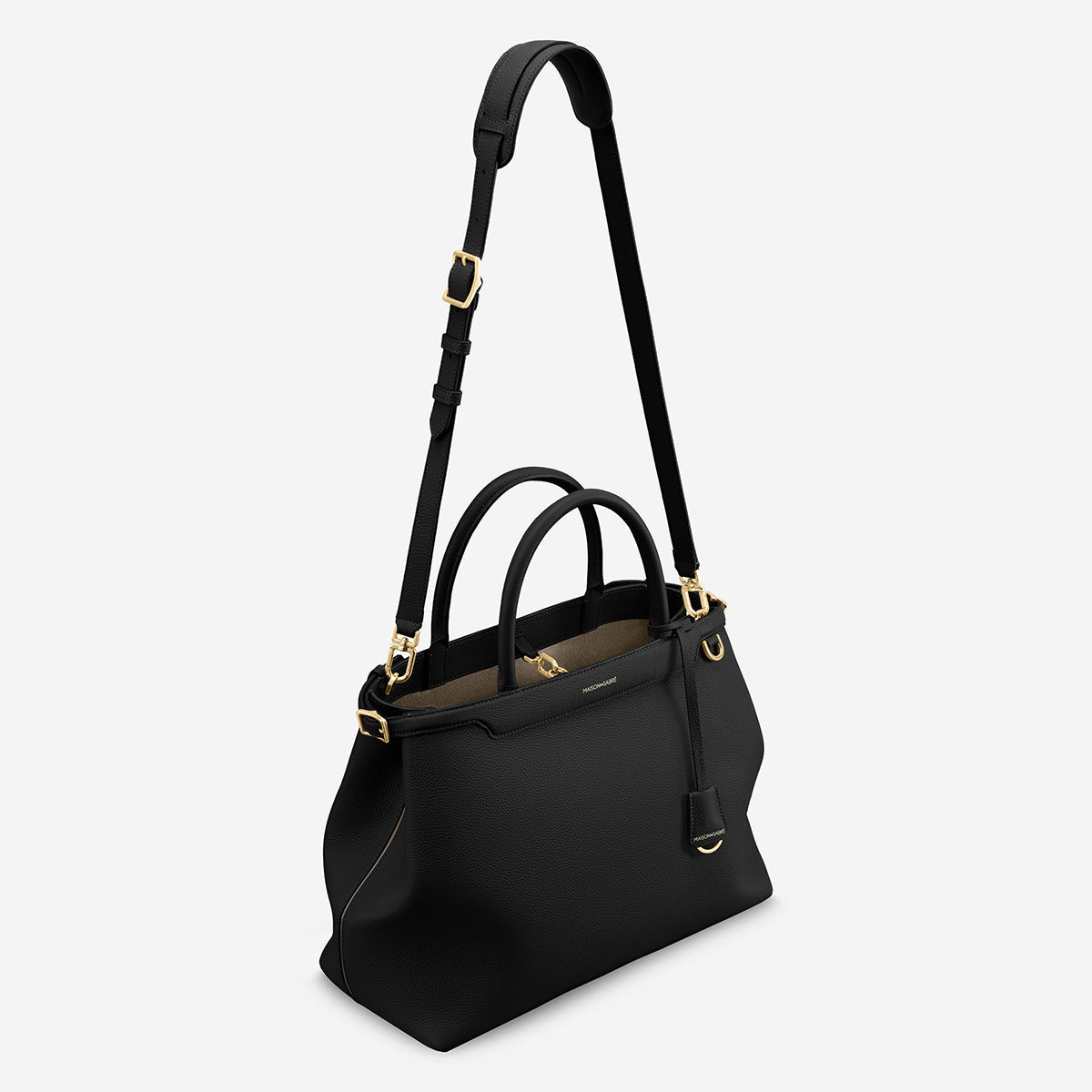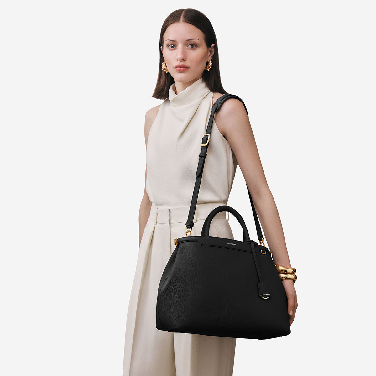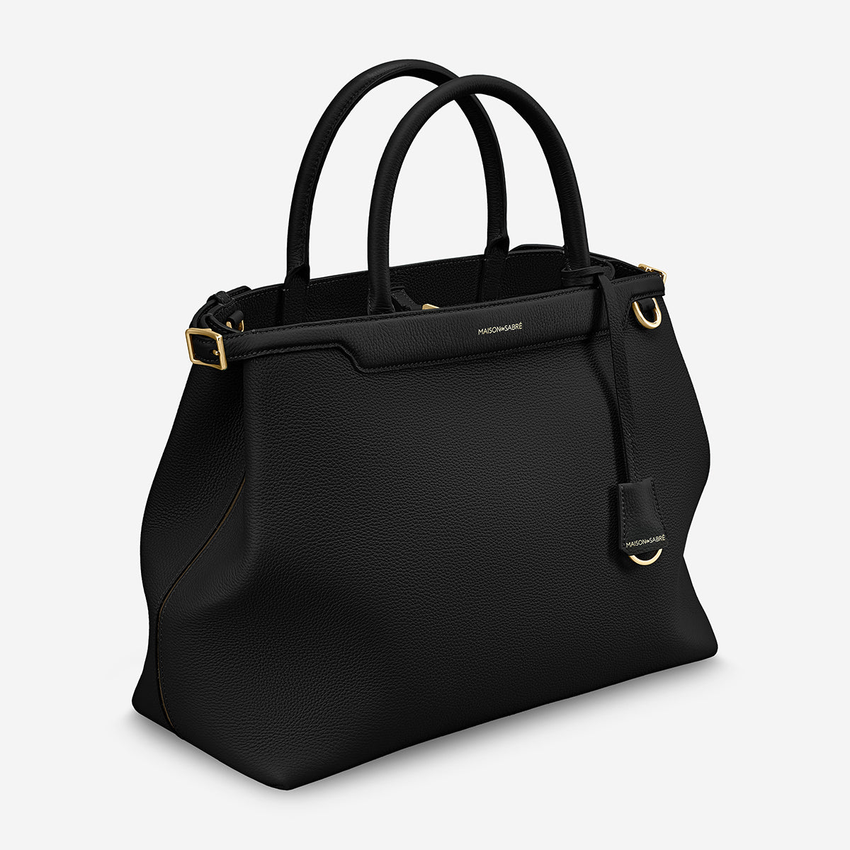 ロール仕上げのレザーキャリーハンドル、中央の縫い目にアクセントカラーを配したデザイン、特徴的な曲線シルエットなど、9つのMAISON de SABRÉのデザインコードを取り入れ、彫刻のような存在感を放つフラッグシップバッグに。