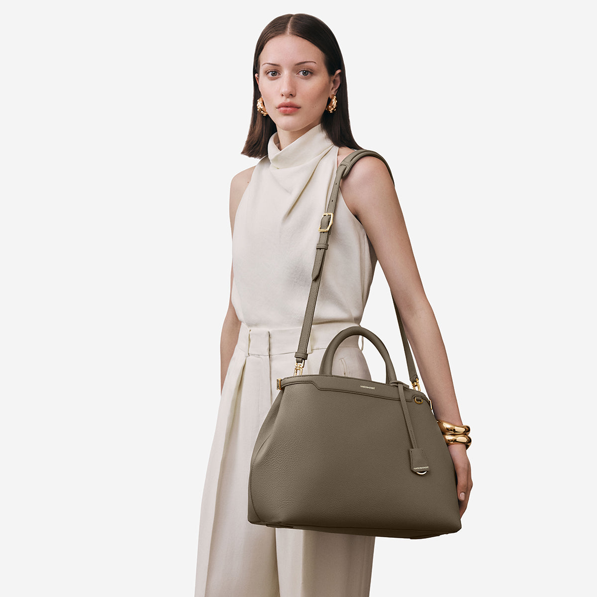 すべての特別な瞬間を経て生まれた、ブランドコードの結晶とも言えるフラッグシップモデル、ラージパレス。 バターのように柔らかなカーフレザーで初めて仕立てられたバッグは、使い込むほどに柔らかさを増す流れるようなシルエット。 挑戦を続けるプロフェッショナルのためにデザインされた日常に寄り添うバッグは、調整可能なレザーベルトと内側のブリッジクリップで比類なきセキュリティを実現。大型ロールハンドルとパッド入りショルダーストラップで、1日中快適に持ち運び可能。 アクセントラインにはスエードを使用し、内側の柔らかいナチュラルスエードへとつながり、14インチノートパソコン、13インチiPad Pro、A4書類、個人用アイテムをまとめて収納可能。 SABRÉMOJI™チャームやクリップ式アクセサリーをSABRÉMOJI™チャームリンクに取り付けて、バッグを自分仕様にパーソナライズ可能。 9つのMAISON de SABRÉのアイコニックなデザインコードを備え、プロフェッショナルのための究極の存在感を放つラージパレス。