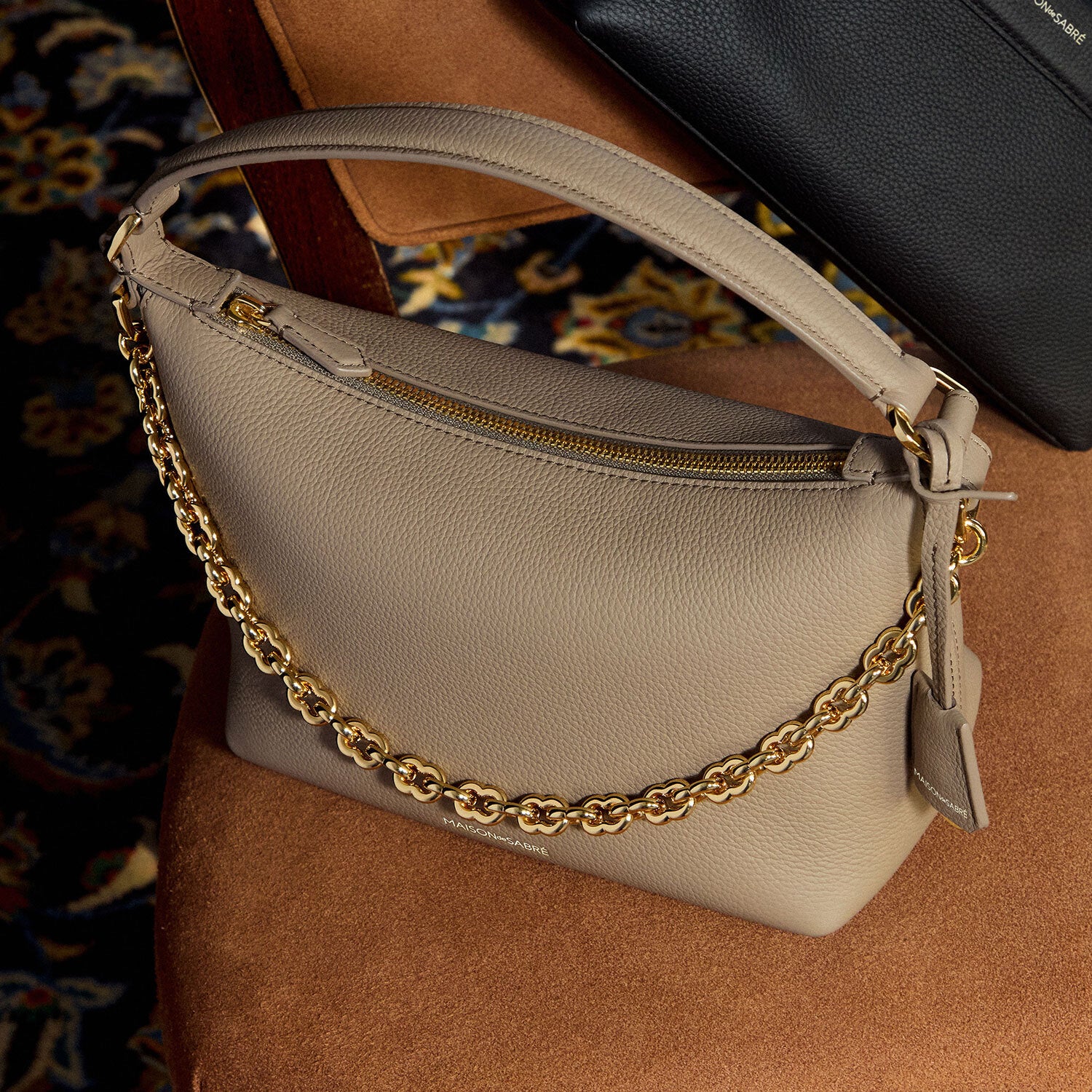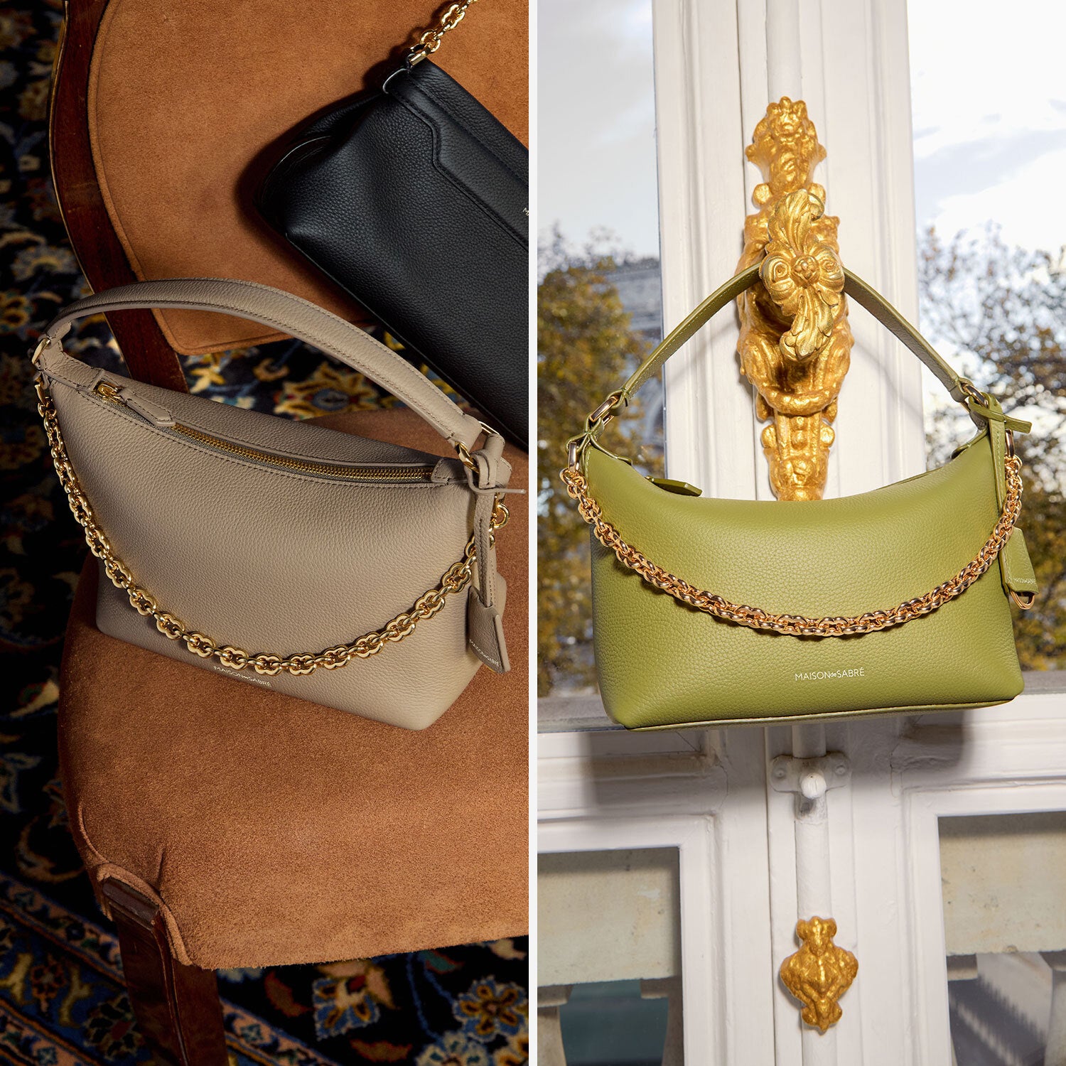 ベストセラースモールソフトホーボーの限定版が登場。 柔らかなカーフレザーがオリジナルアイコンの彫刻的な曲線をやさしく包み、夜の装いにふさわしい、贅沢で洗練された存在感に。 ブランドの象徴コードと無限の可能性を表現する8の字リンクで光を受けてきらめく、手磨き仕上げのMAISON de SABRÉ エタニティチェーンが、 2つのSABRÉMOJI™ チャーム用Dリングで個性を添え、取り外し可能なクロスボディレザーストラップで多彩なスタイルに対応。内側にはナチュラルスエードのライニングを備え、収納も優雅に。 夜のスタイルを彩るバッグとして、忠実に受け継いだオリジナルモデルの特長。 柔らかさと安定感を兼ね備えたフォルム、内部のジップ&スリップポケット、パッド入りボンベハンドルなど、細部まで丁寧に製作。 新たに加わった2色のカラーで、夜のシーンに華やぎを添え、すべての視線を集める存在に。