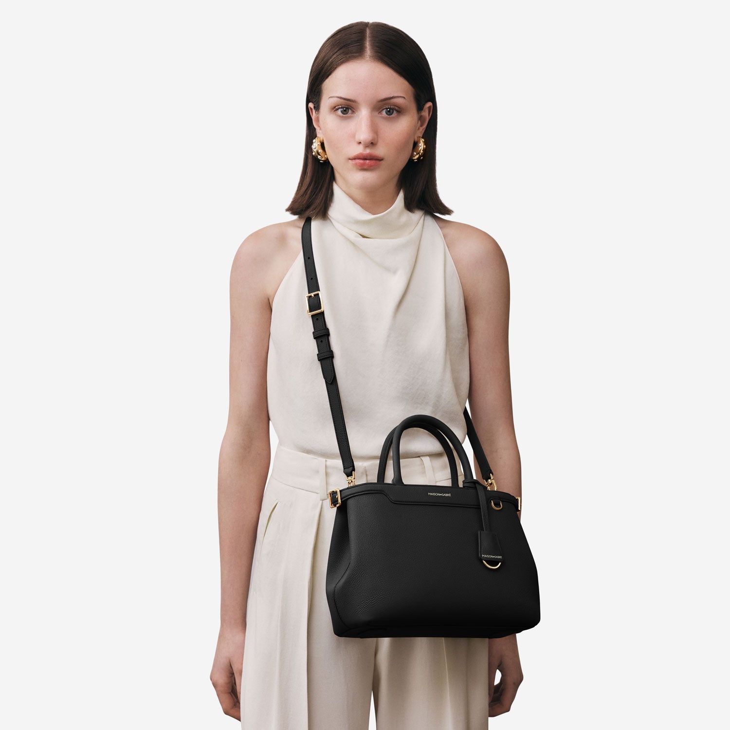 MAISON de SABRÉの8年間のクラフトマンシップを称えるフラッグシップモデル、ミディアムパレス。バターのように柔らかなカーフレザーで仕立てられたバッグは、使い込むほどに柔らかさを増す流れるようなシルエット。 9つのアイコニックなブランドコードを体現した、調整可能なレザーベルト、ブリッジクリップ、ロールハンドル、取り外し可能なクロスボディストラップ、そしてアクセントカラーのナチュラルスエードライニングを特徴としたサイドライン。 iPhone Pro Max、ポーチ、ウォーターボトル、日常の必需品を収納可能で、形を崩さずスマートな持ち運びを実現。SABRÉMOJI™チャームリンクにより、チャームやアクセサリーで自由にパーソナライズ可能。 ラージパレスのコンパクトモデルとして、洗練された佇まいであらゆるスタイルを一層格上げ。