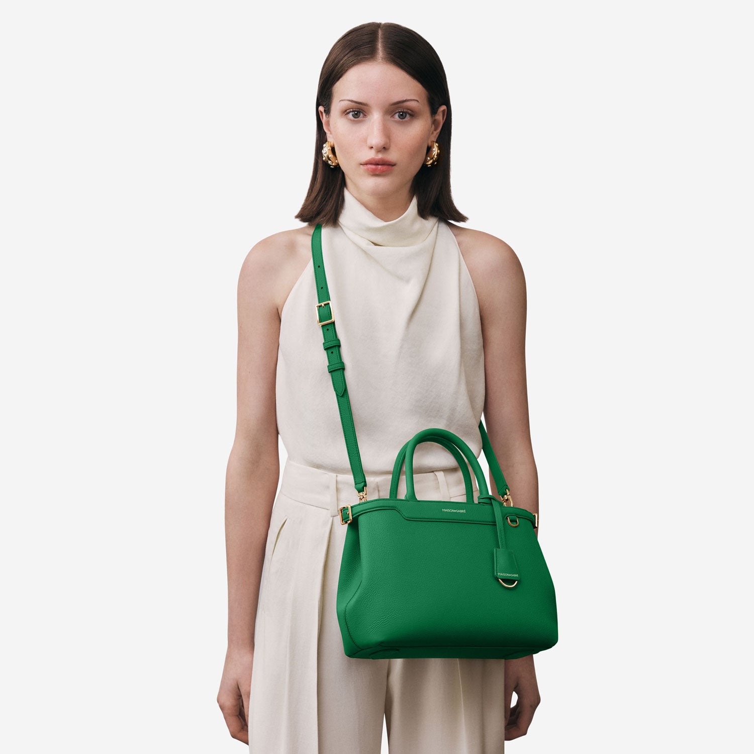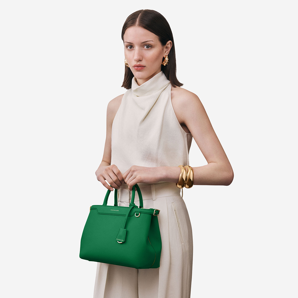 MAISON de SABRÉの8年間のクラフトマンシップを称えるフラッグシップモデル、ミディアムパレス。バターのように柔らかなカーフレザーで仕立てられたバッグは、使い込むほどに柔らかさを増す流れるようなシルエット。 9つのアイコニックなブランドコードを体現した、調整可能なレザーベルト、ブリッジクリップ、ロールハンドル、取り外し可能なクロスボディストラップ、そしてアクセントカラーのナチュラルスエードライニングを特徴としたサイドライン。 iPhone Pro Max、ポーチ、ウォーターボトル、日常の必需品を収納可能で、形を崩さずスマートな持ち運びを実現。SABRÉMOJI™チャームリンクにより、チャームやアクセサリーで自由にパーソナライズ可能。 ラージパレスのコンパクトモデルとして、洗練された佇まいであらゆるスタイルを一層格上げ。