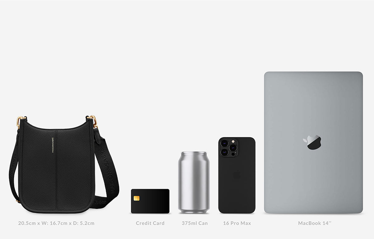 お出かけに不可欠なスマホやウォレット、鍵、AirPodsやサングラスなどをまとめて収納可能。従来のムーンショルダーバッグよりひと周り小さくなってデイリー使いにちょうど良いサイズ感。
